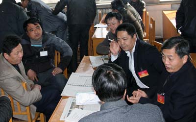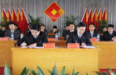 董事長(zhǎng)程同海代表企業(yè)與職工方代表李金營(yíng)簽定工資協(xié)議